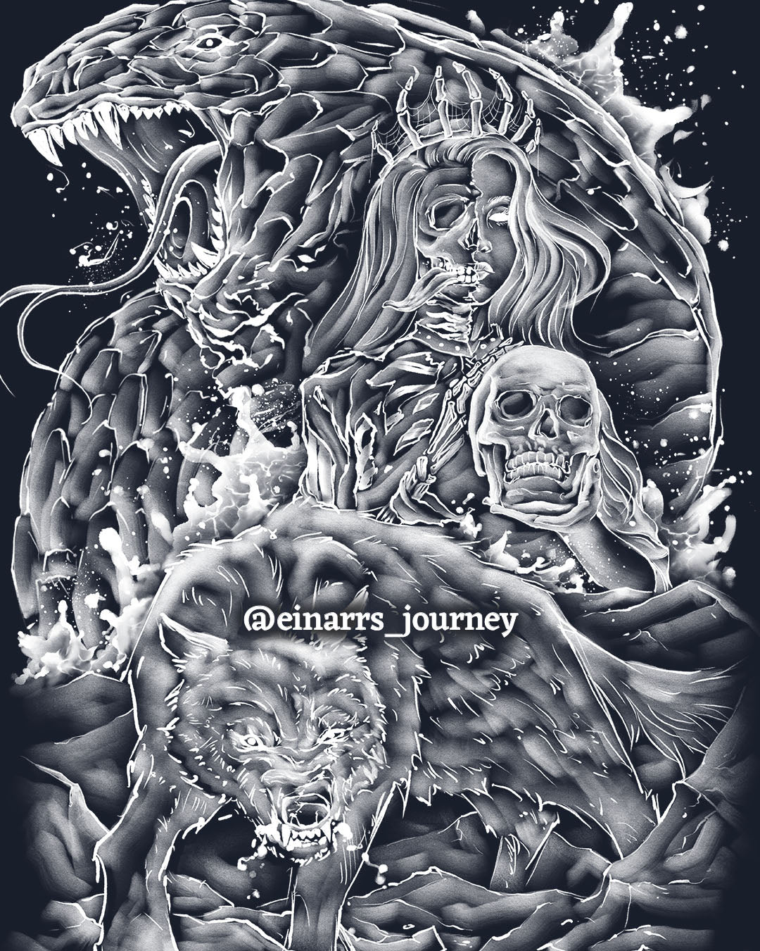 In what is arguably one of his greatest acts of treachery, Loki fathered three remarkable yet terrifying and ominous offspring: Hel, Fenrir, and Jǫrmungandr. Their mother is a giantess by the name of Angrboða.