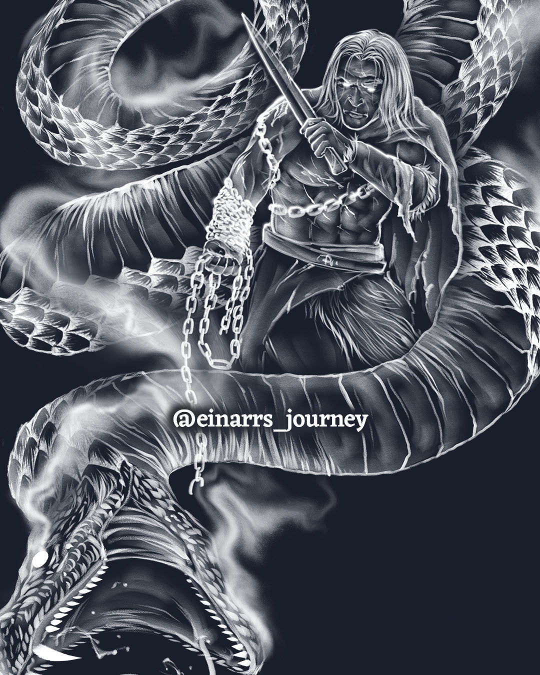 While imprisoned, Loki is said to be tormented by a venomous serpent, slain and placed above his head by Skadi, with the venom dripping onto his face, causing him intense pain. His faithful wife, Sigyn, remained by his side, holding a bowl to catch the venom and spare Loki from its effects. However, Sigyn would need to empty the bowl, and it was in these moments that a drop of venom would fall on him, causing him to shriek and writhe in agony, causing what we know as earthquakes.