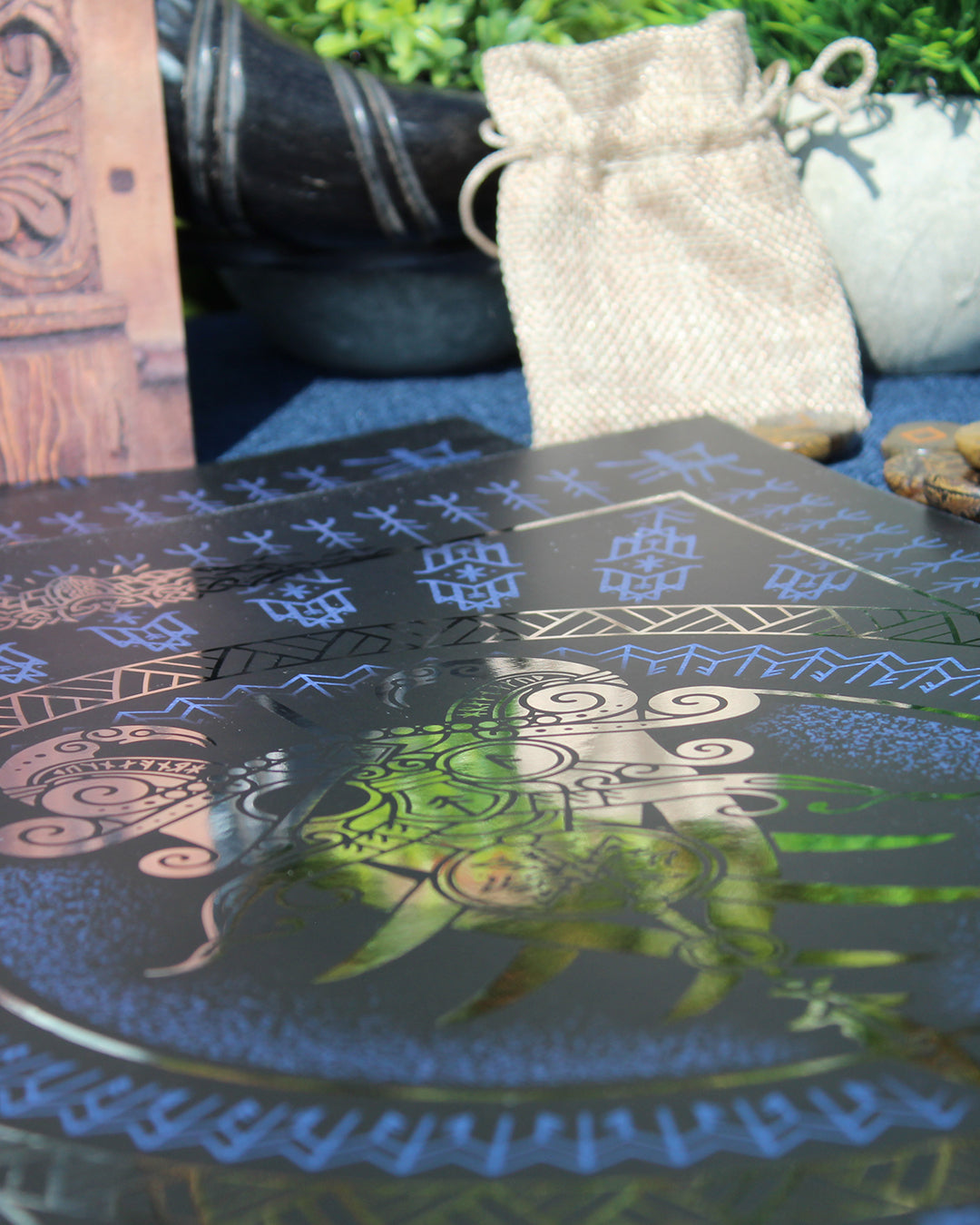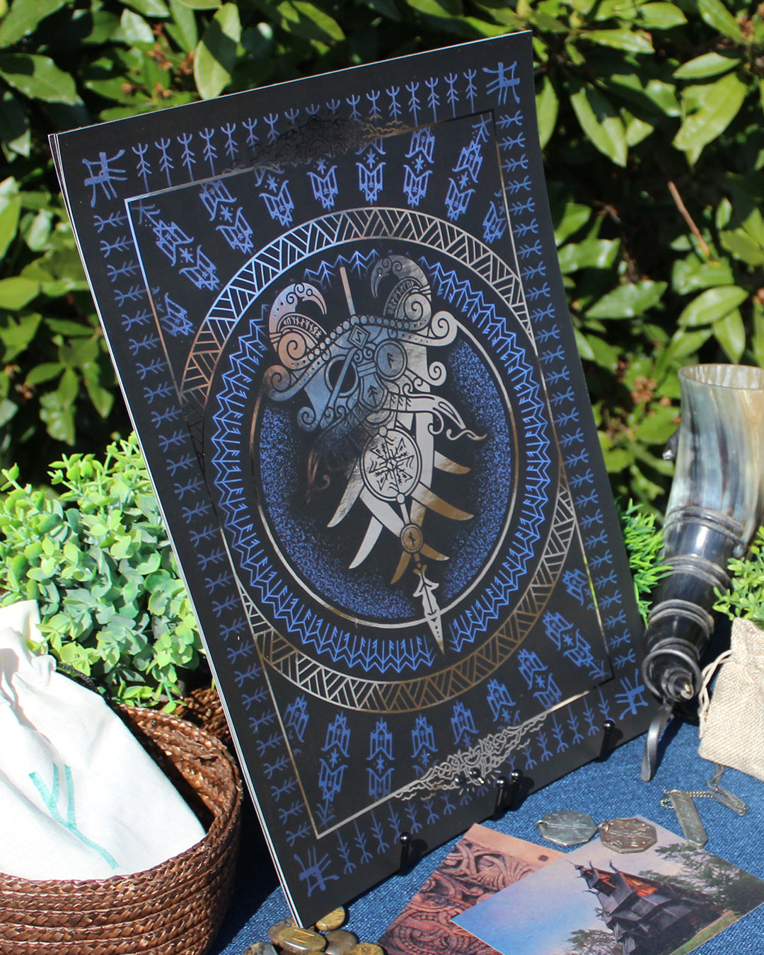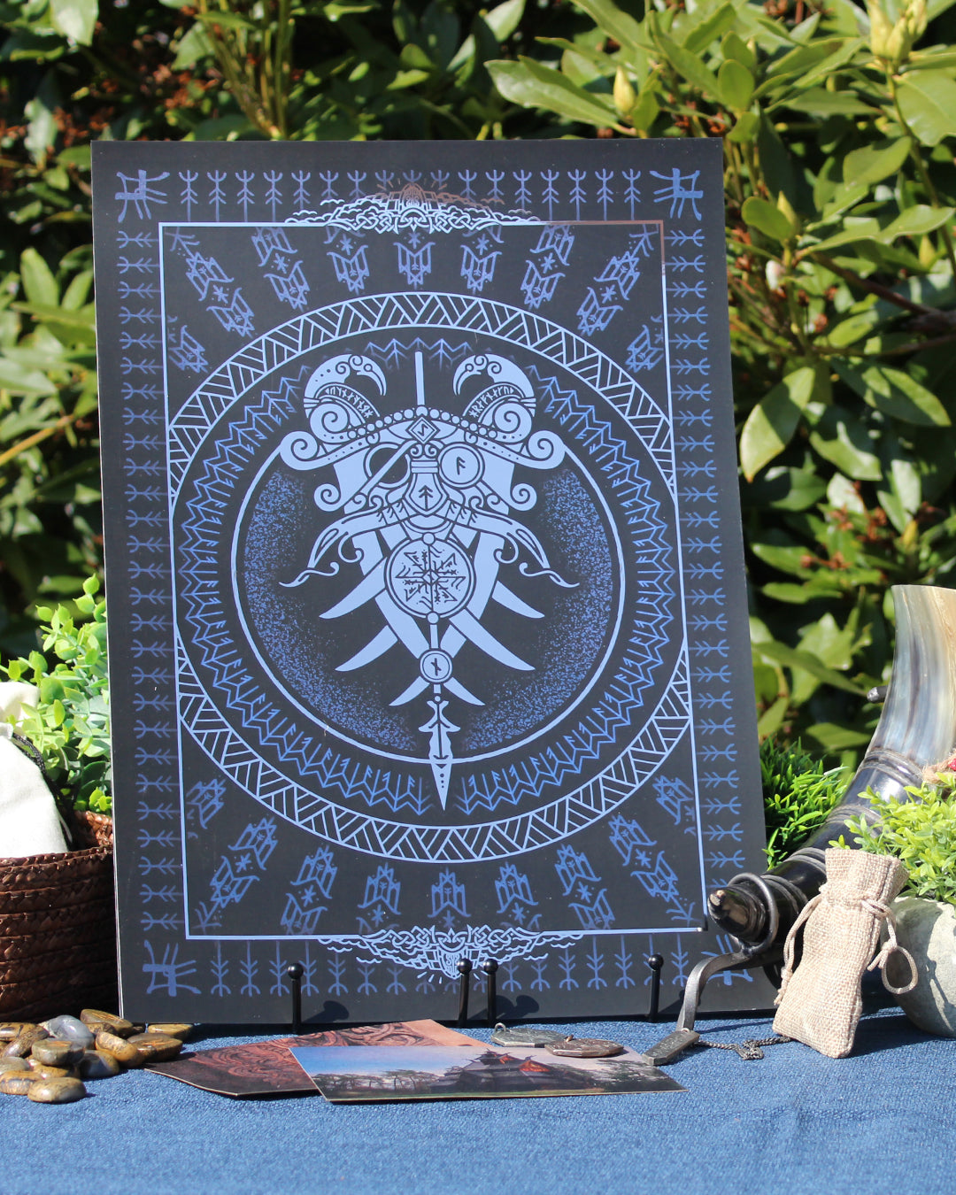 An A3 Art print of my Odin godmask, drawn with inspiration from Viking-age art. This print has silver foiling, making it perfect for you loot goblins out there.
