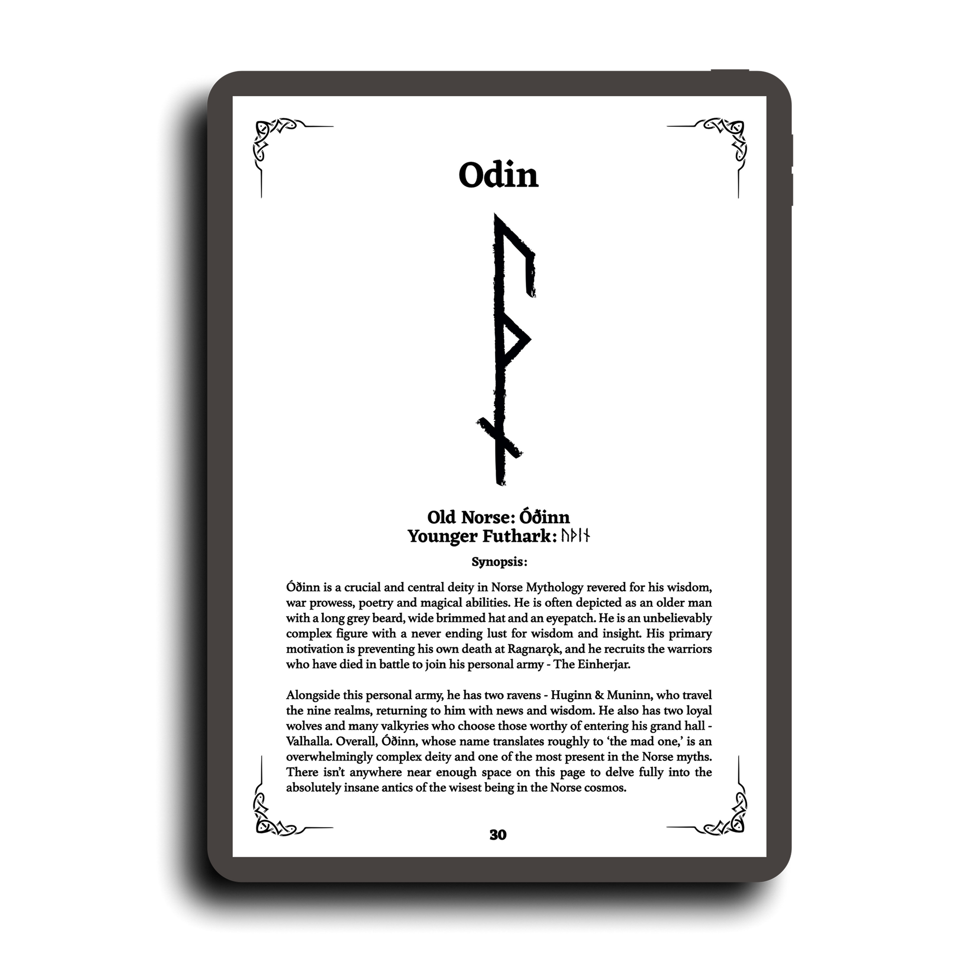Explore gods, giants, creatures, and cosmic realms. Each entry includes a synopsis, Old Norse, Younger Futhark translation and a personal use Bindrune.